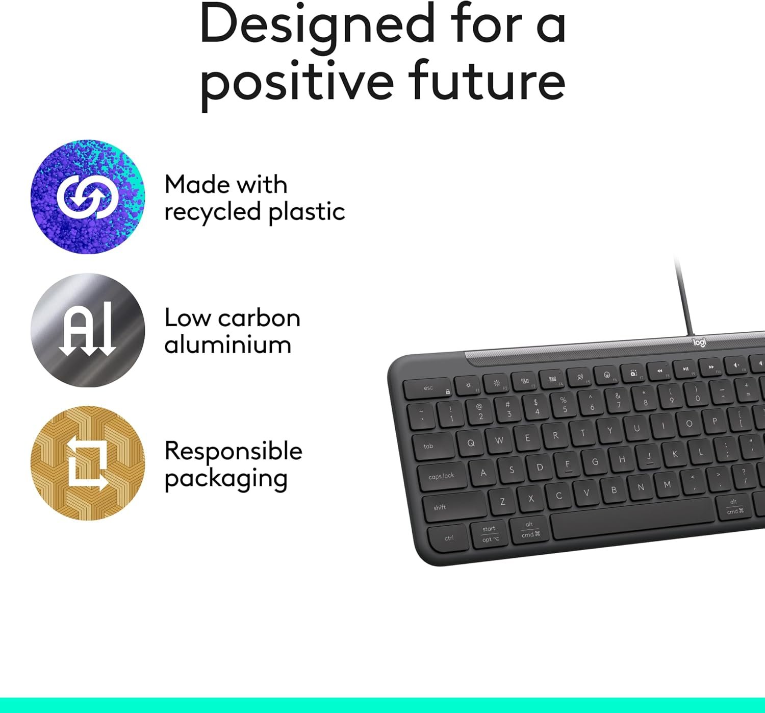 | Recycled Content | Keyboard: 66% PCR plastic; Mouse: 71% PCR plastic |