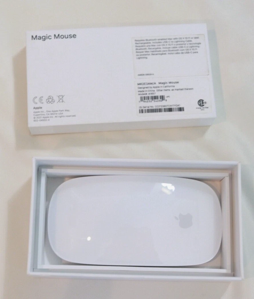 Apple Magic Mouse (MK2E3ZA/A) — Wireless Bluetooth Mouse, Rechargeable, Multi‑Touch Surface, White Finish