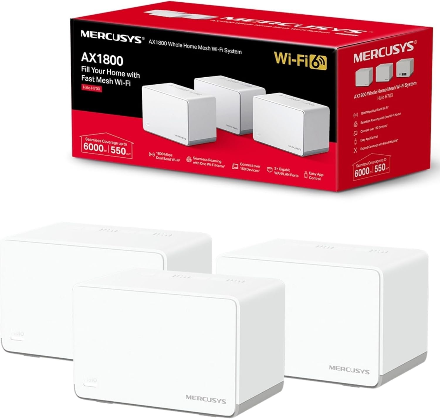 The MERCUSYS Halo H70X 3-Pack is a high-performance mesh Wi-Fi 6 system designed to eliminate dead zones and deliver seamless connectivity across large homes. With three units working together, it blankets up to 6,000 ft² (550 m²) with dual-band AX1800 speeds. Each unit includes three gigabit Ethernet ports and supports over 150 devices, making it ideal for smart homes, streaming, and gaming.