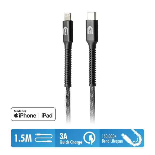 The OEM CP 2617-BK is a high-quality USB-C to Lightning cable designed for fast charging and data sync across Apple devices. With Apple MFi certification, it ensures safe and reliable performance for iPhones, iPads, and AirPods. The 1.5-meter length offers flexibility for desktop, bedside, or travel use, while the durable black jacket resists wear and tangling.