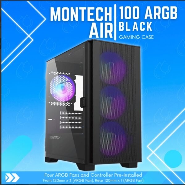The MONTECH AIR 100 ARGB-B is a compact Micro-ATX case engineered for high airflow and vibrant lighting. With four pre-installed ARGB fans, a fine mesh front panel, and a swivel tempered glass side panel, it delivers performance and aesthetics in a space-saving form. Ideal for builders who want a clean, efficient layout without sacrificing cooling or style, the AIR 100 ARGB is ready for modern gaming and productivity setups.