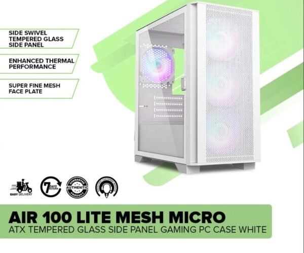 MONTECH AIR 100 LITE Micro-ATX Case – AIR100LITE-W (White, 2 x 120mm Fans, Mesh Front Panel, Swivel Tempered Glass)