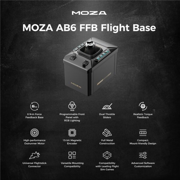 The MOZA AB6 Flight Simulator delivers professional‑grade realism with a compact 6Nm force feedback base and precision flightstick integration. Crafted from aviation‑grade aluminum alloy and high‑strength steel, it provides outstanding rigidity and durability. With a 15‑bit magnetic encoder, customizable RGB front panel, and MOZA Cockpit software, the AB6 offers immersive control for flight simulation enthusiasts on PC.