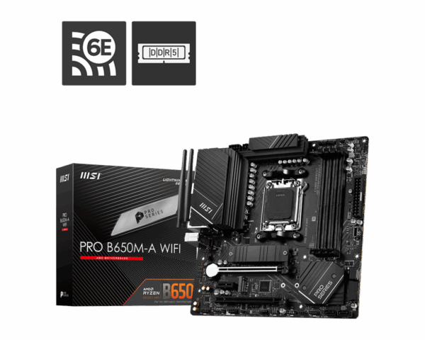 • Ryzen 7000 READY – The PRO B650M-A WIFI is a compact M-ATX motherboard outfitted with the AMD B650 chipset (AM5, Ryzen 7000 ready); The VRM features MSI Core Boost technology for improved stability & performance