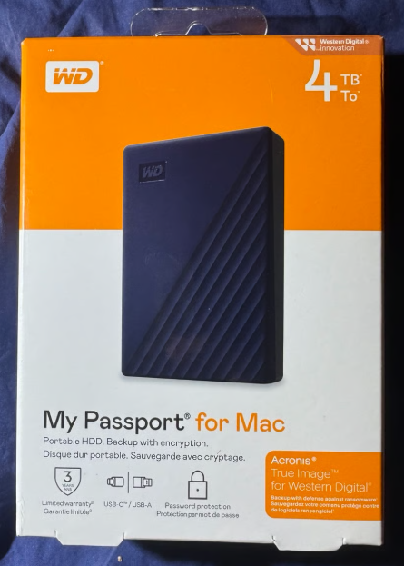 The WD My Passport for Mac 4TB (Blue) is a portable external hard drive designed specifically for macOS users. With USB-C connectivity, password-enabled 256-bit AES hardware encryption, and Time Machine compatibility, it delivers secure, high-capacity storage that integrates seamlessly with Mac workflows for backups, file transfers, and everyday storage needs.