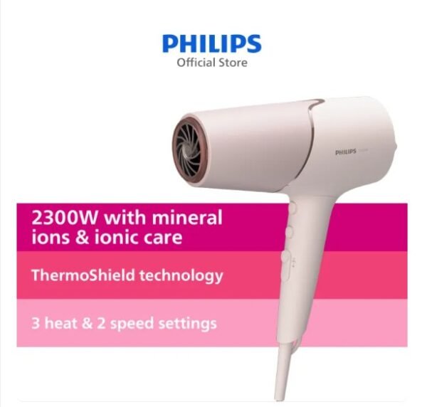 The Philips 5000 Series Hair Dryer BHD530/03 delivers fast drying with advanced care. Designed for users who want salon-quality results at home, it features ThermoShield technology to protect hair from heat damage, ionic conditioning for frizz control, and a powerful 2300W motor for efficient styling. Its ergonomic design and multiple settings make it ideal for all hair types and styling needs.