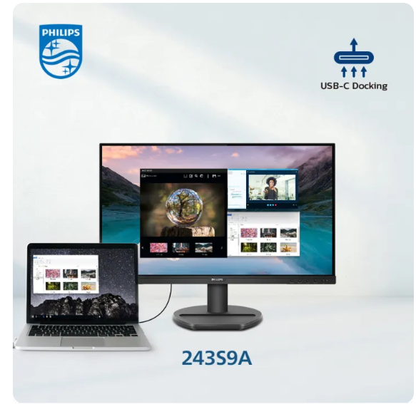 Enhance your workspace with the Philips 243S9A — smart connectivity and vibrant IPS performance in one sleek monitor.