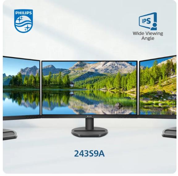 The Philips 243S9A is a 23.8-inch IPS Full HD monitor designed for professionals and modern workspaces. With USB-C connectivity for single-cable convenience, DisplayPort and HDMI for flexibility, and a 75Hz refresh rate for smoother visuals, it balances productivity and entertainment. Its slim design and VESA mount compatibility make it ideal for ergonomic setups at home or in the office.