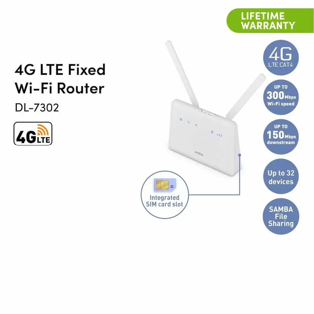 PROLINK DL-7302 LTE CAT4 Wi-Fi 4G Home Router β SIM Slot, 150Mbps LTE, 300Mbps Wi-Fi, 4 LAN Ports, Dual External Antennas