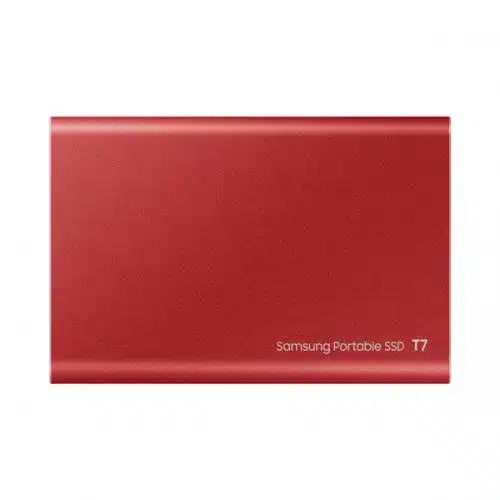 The Samsung T7 Portable SSD in red offers blazing-fast performance and robust data protection in a sleek, compact form. Powered by PCIe NVMe technology and USB 3.2 Gen 2 interface, it delivers rapid file transfers and secure storage for professionals, gamers, and mobile users. With a durable metal body and cross-platform compatibility, the T7 is built for speed and reliability on the go.