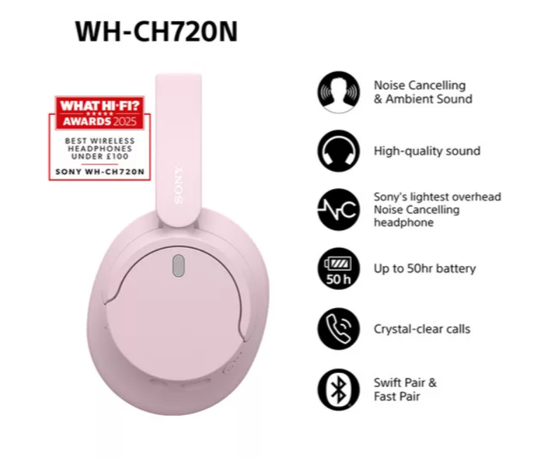 Sony WH-CH720N Wireless Noise-Canceling Headphones (Pink) â Lightweight over-ear design with Bluetooth connectivity, adaptive ANC, and extended battery life