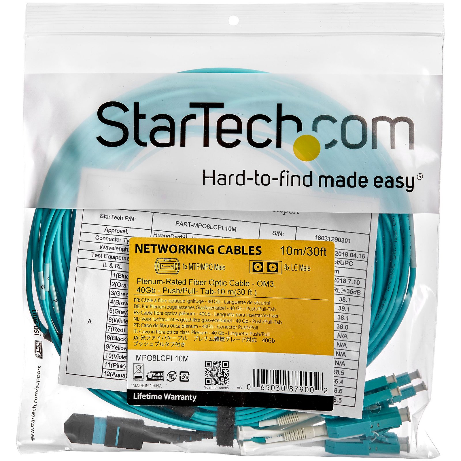 The StarTech MPO8LCPL1M is a 1-meter OM3 multimode fiber breakout cable designed for high-speed 40G deployments in data centers and enterprise networks. It features a single MTP (Female) connector on one end and breaks out into four LC duplex connectors, enabling seamless QSFP+ to SFP+ transitions. The plenum-rated OFNP jacket ensures safe installation in air-handling spaces, and the push-pull tab simplifies handling in dense patch panels.