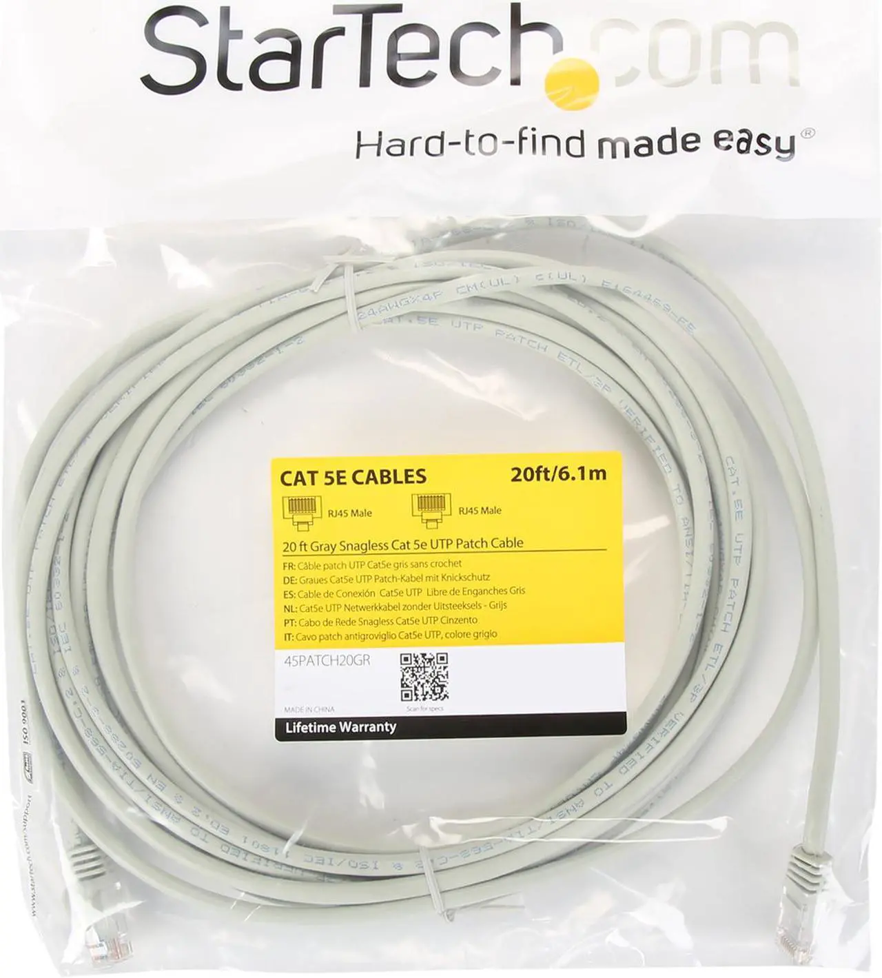 The StarTech M45PATCH20GR is a 20-foot Cat5e patch cable engineered for dependable Ethernet connectivity across desktop, office, and home environments. Featuring molded RJ45 connectors and a flexible gray PVC jacket, it supports Power-over-Ethernet (PoE) and meets or exceeds Cat5e performance standards. Ideal for longer cable runs, this cable ensures consistent signal transmission and long-term durability.