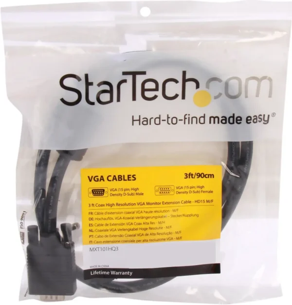The StarTech MXT101HQ3 is a 3‑foot SVGA monitor extension cable designed to extend VGA connections between computers and displays. With coaxial wiring and ferrite cores, it ensures superior signal integrity and reduced interference, making it ideal for desktop setups, office environments, and short‑distance AV applications.