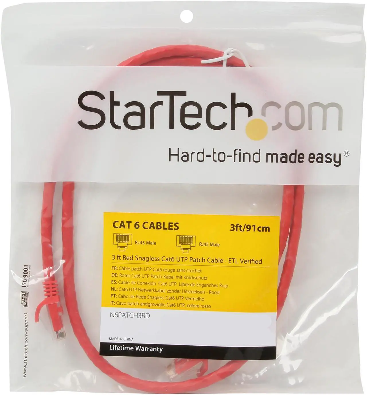 StarTech N6PATCH3RD – 3 ft Red Cat6 UTP Snagless Patch Cable with RJ45 connectors