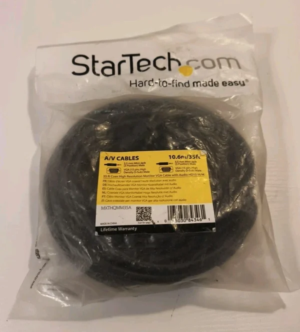 The StarTech MXTHQMM35A is a 35-foot VGA monitor cable engineered for high-resolution video transmission across extended distances. Featuring HD15 male-to-male connectors and coaxial wiring for each signal line, it delivers sharp, stable visuals with reduced interference. Its durable PVC jacket and molded strain relief make it ideal for classrooms, auditoriums, conference rooms, and professional AV environments requiring reliable VGA connectivity.