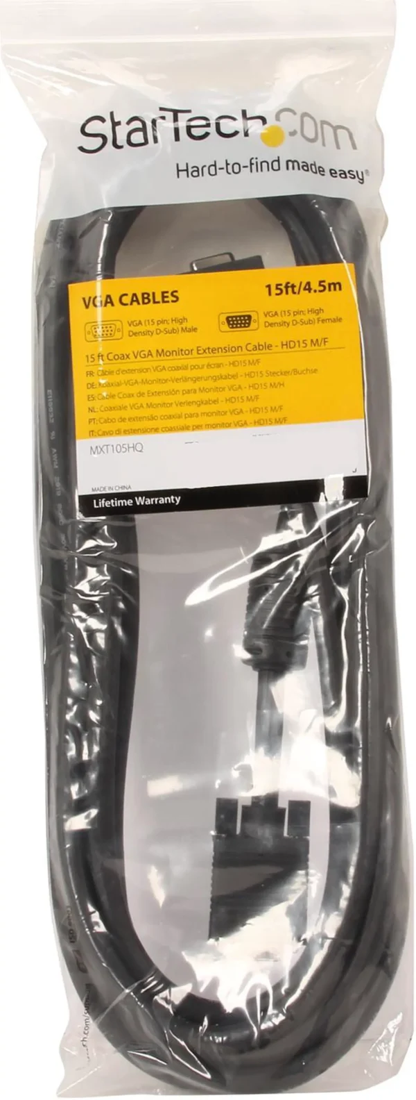 The StarTech MXT101HQ35 VGA extension cable delivers reliable long-distance video connectivity with coaxial wiring for superior signal quality. Designed with HDDB15 male-to-female connectors, it supports high-resolution analog video for monitors, projectors, and legacy display devices across extended setups.