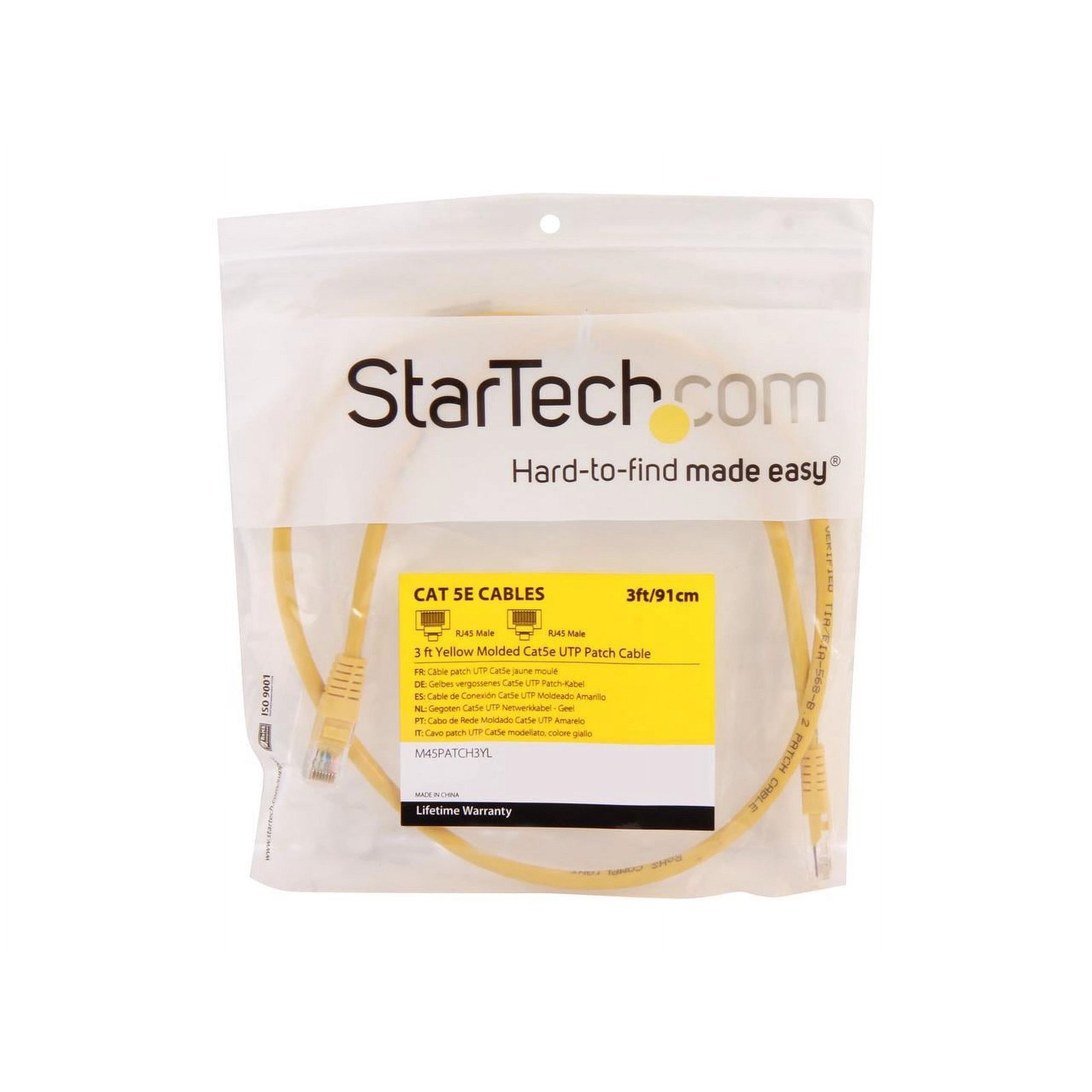 The StarTech M45PATCH3YL is a 3-foot Cat5 patch cable engineered for high-performance Ethernet connectivity in compact environments. Featuring molded RJ45 connectors and a flexible yellow PVC jacket, it supports Power-over-Ethernet (PoE) and meets Cat5 performance standards. Ideal for patch panels, switch-to-device links, and short cable runs, this cable ensures reliable signal transmission and long-term durability.
