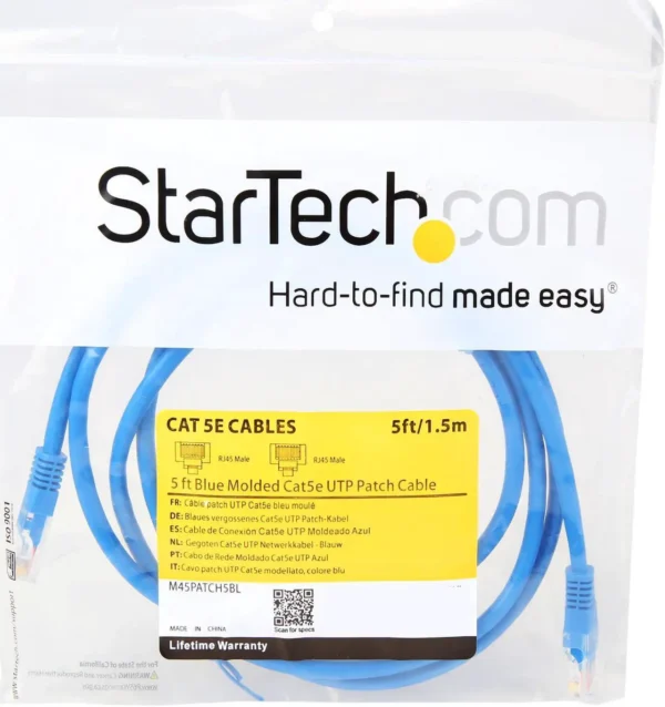 The StarTech M45PATCH5BL is a 5-foot Cat5e patch cable engineered for high-performance Ethernet connectivity in compact environments. Featuring molded RJ45 connectors and a flexible blue PVC jacket, it supports Power-over-Ethernet (PoE) and meets or exceeds Cat5e performance standards. Ideal for patch panels, switch-to-device links, and short cable runs, this cable ensures reliable signal transmission and long-term durability.