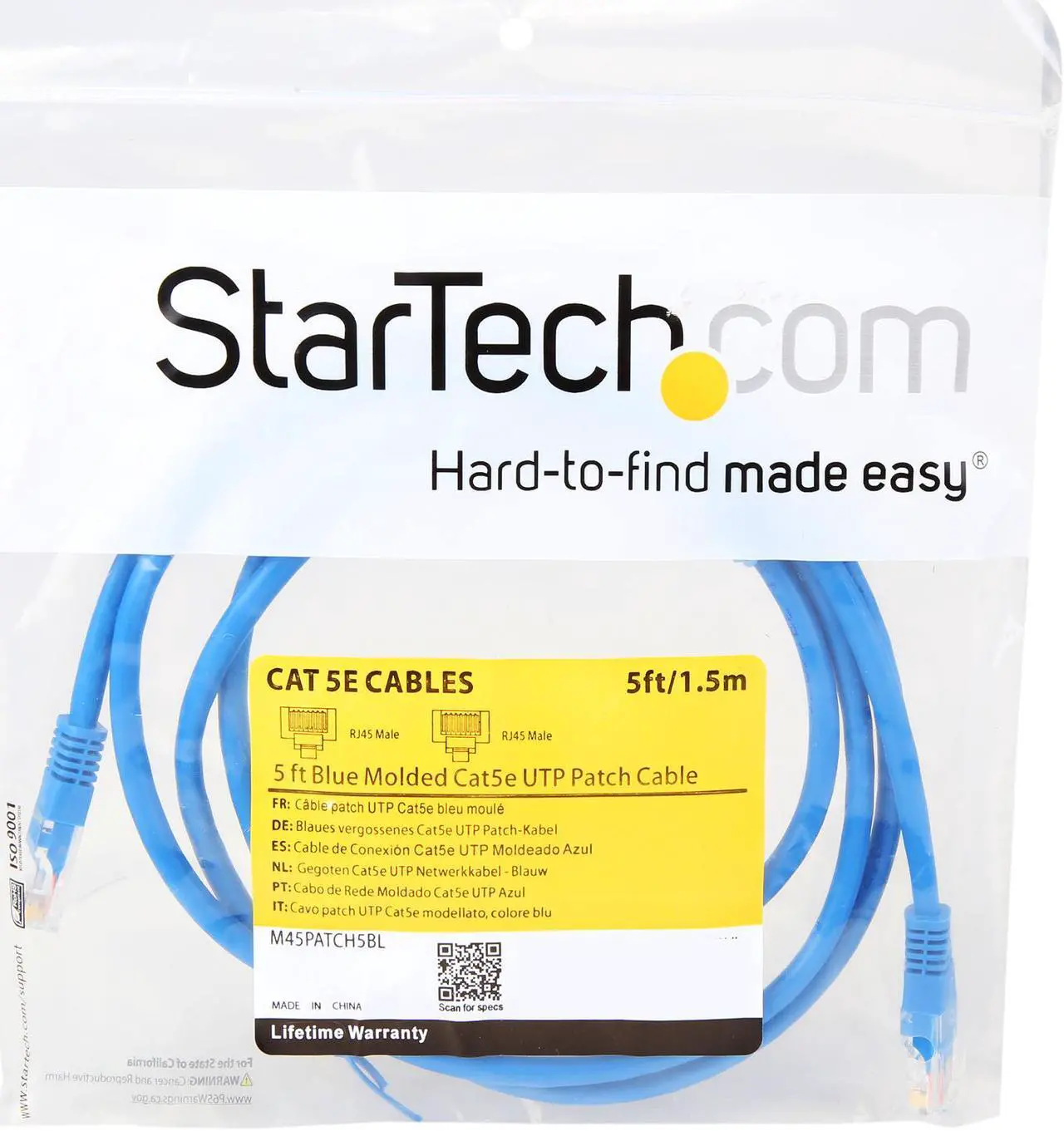 StarTech M45PATCH5BL 5ft Cat5e UTP Patch Cable β RJ45 Male to RJ45 Male, Molded Connectors, Blue PVC Jacket