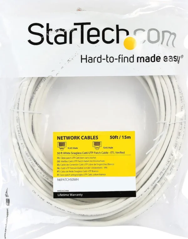 The StarTech N6PATCH50WH is a 50‑foot Cat6 UTP patch cable designed for extended Ethernet connections. Featuring snagless molded boots and RJ45 connectors, it ensures reliable, interference‑free performance across long distances. Its white finish provides a clean, professional look, making it ideal for enterprise, office, and home networking setups requiring durable, high‑speed connectivity.