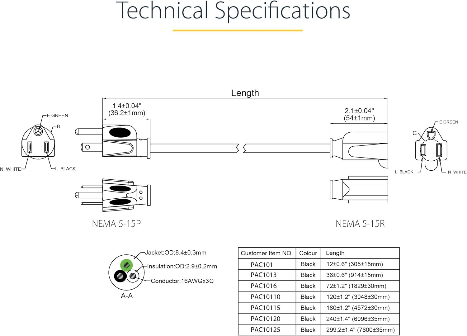 The StarTech PAC10125 is a 25 ft power extension cable designed to extend the reach of your existing power cords. Featuring standard NEMA 5-15P to NEMA 5-15R connectors, it provides a reliable solution for powering computers, monitors, printers, and other essential devices. Its long length offers flexibility in equipment placement while maintaining safe and durable performance.