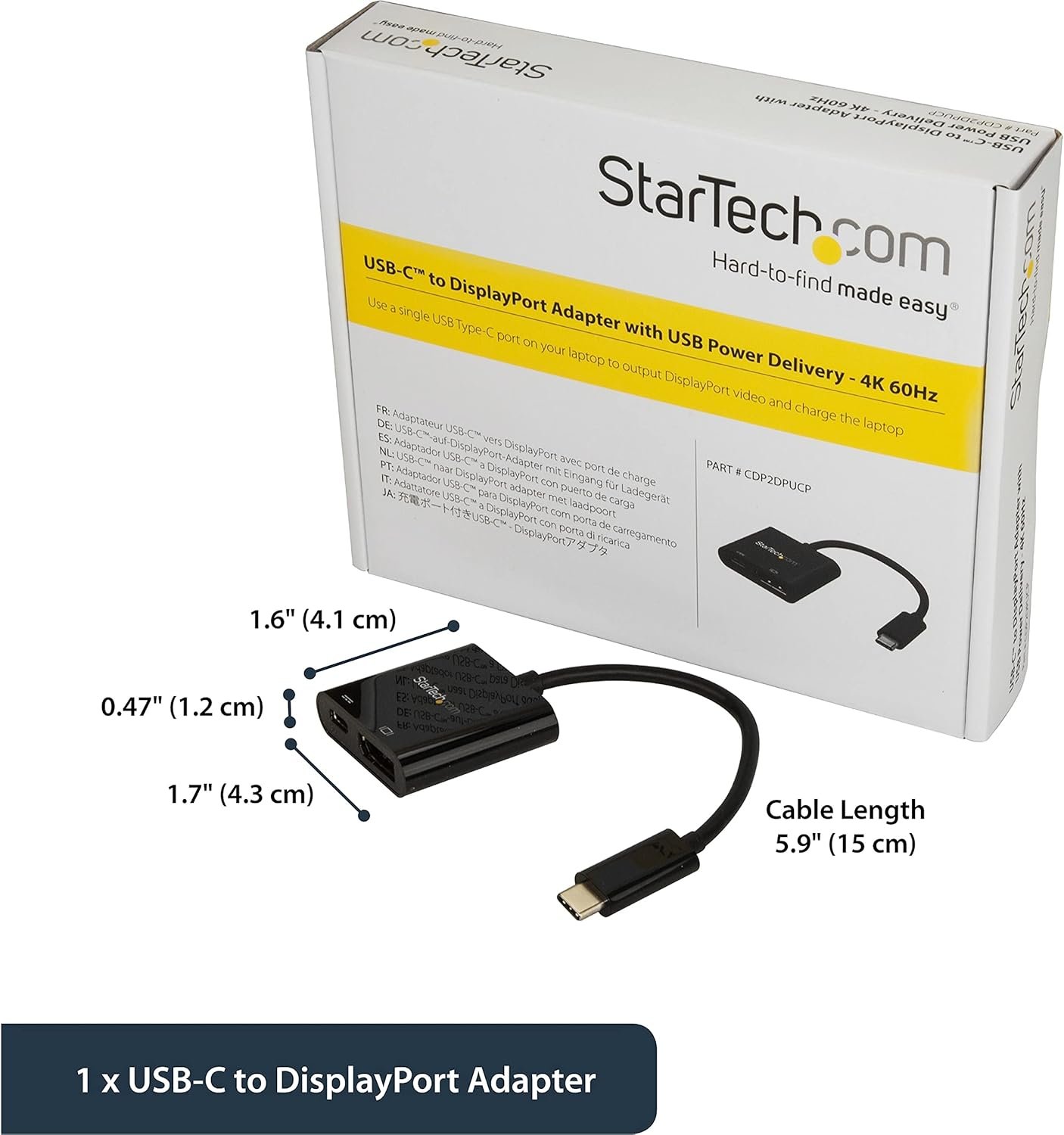 StarTech CDP2DPUCP USB-C to DisplayPort Adapter β 4K 60Hz, DP 1.2, 60W PD Pass-Through, Thunderbolt 3 Compatible