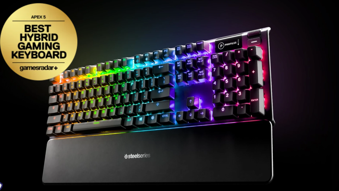Elevate your gaming setup with the SteelSeries Apex 5 Hybrid Mechanical RGB Keyboard and magnetic wrist rest.