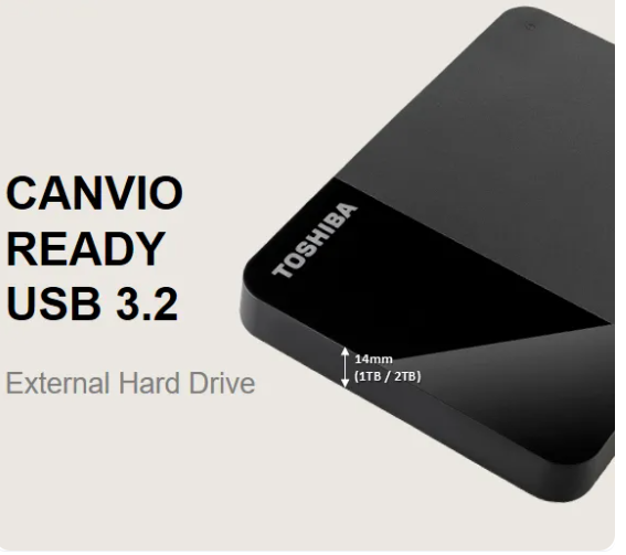 The Toshiba Canvio Ready B3 2TB external hard drive offers simple, plug‑and‑play storage for documents, photos, movies, and backups. Powered via USB 3.2 Gen 1, it delivers transfer speeds up to 5 Gbit/s, ensuring quick and reliable access to your files. Compact and portable, it’s designed for everyday use at home, school, or office.