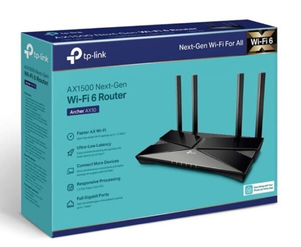 The TP-Link Archer AX10 is a high-efficiency AX1500 Wi-Fi 6 router designed for homes and small offices seeking faster speeds, broader coverage, and reduced congestion. Powered by a triple-core processor and equipped with OFDMA and MU-MIMO technologies, it enables simultaneous streaming, gaming, and browsing across multiple devices. Its dual-band architecture and full gigabit ports ensure reliable performance for wired and wireless setups.