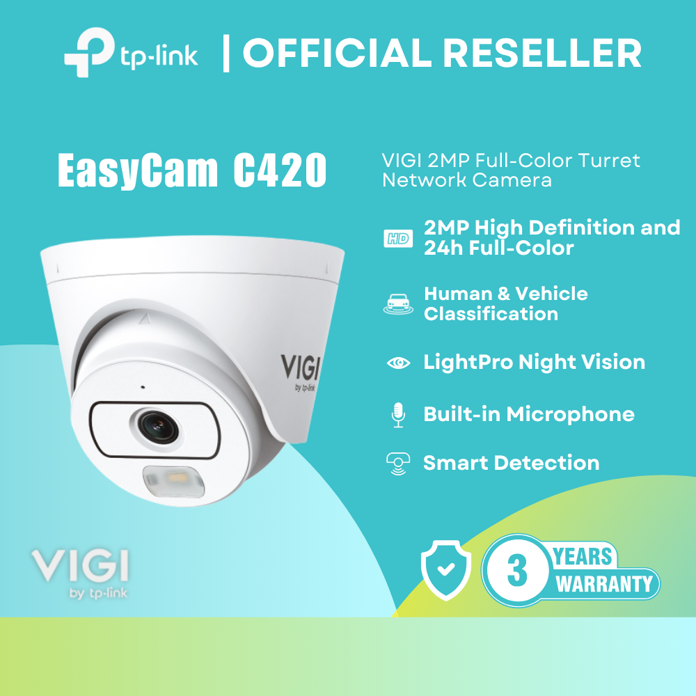 The TP-Link VIGI EasyCam C420 is a compact 2MP full-color turret network camera designed for reliable indoor and outdoor surveillance. Featuring a 2.8mm fixed lens, it provides a wide-angle field of view for broader coverage. With AI-powered detection, enhanced low-light performance, and durable weatherproof housing, it ensures accurate monitoring and dependable performance. Integrated with the VIGI platform, it supports centralized management and secure remote access.