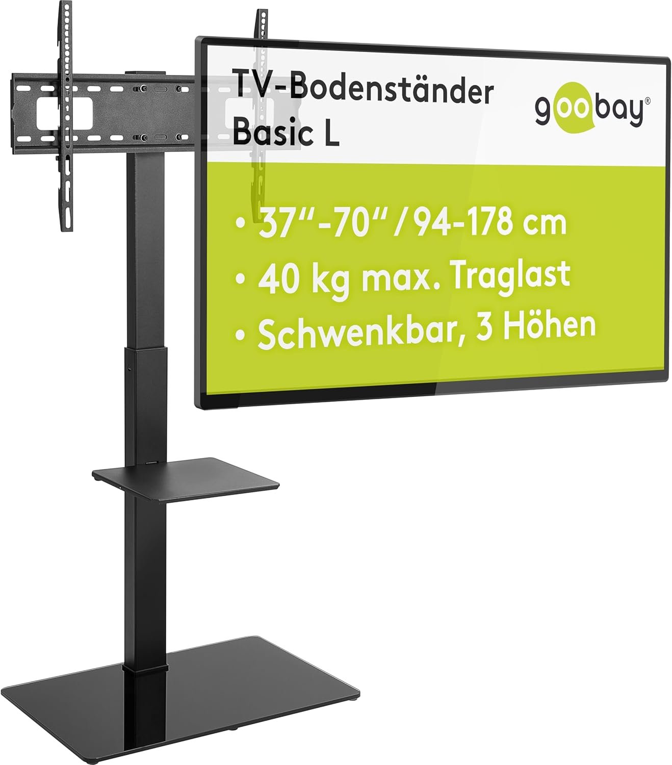 GOOBAY TV Floor Stand Basic L – Model GOOBAY58526, Black Finish, Fits 37–70″ Screens, Integrated Cable Management
