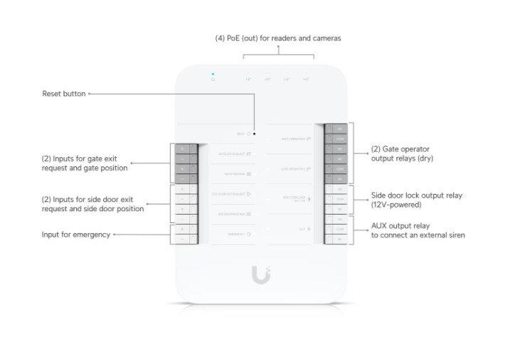 The Ubiquiti UniFi Access Gate Hub is a dedicated controller designed to manage automated gates and barriers within the UniFi Access ecosystem. It provides secure, centralized control for entry points, integrating seamlessly with UniFi Access Readers, controllers, and locks. Built for enterprise and commercial environments, the UA‑Hub‑Gate ensures reliable operation, flexible connectivity, and streamlined access management for outdoor gate deployments.
