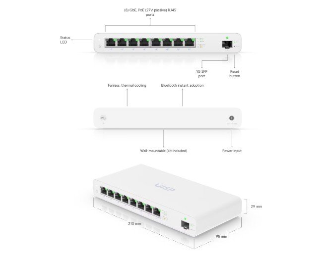 The UISP-S is a Layer 2 managed Gigabit switch built for UISP deployments that need compact, silent operation and passive PoE. It provides eight GbE RJ45 ports with 27V passive PoE and a dedicated 1G SFP uplink, making it a practical choice for powering CPE, bridges, and small edge networks. With Bluetooth setup, in-band management, and a polycarbonate enclosure, it’s designed for dependable, low-maintenance service.