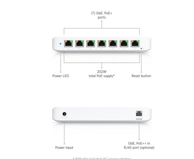 | Total Ports | 8 × GbE RJ45 (7 PoE+, 1 PoE++ input) |