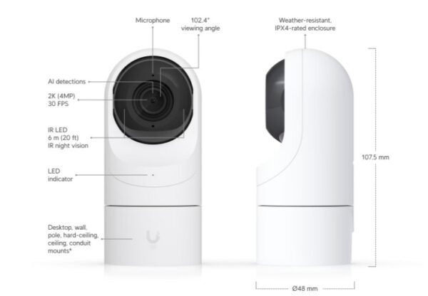 The Ubiquiti UniFi Protect G5 Flex is a versatile surveillance camera designed for both indoor and outdoor use. Delivering sharp 4MP 2K video at 30 frames per second, it features smart detection for people and vehicles, IR night vision, and multiple mounting options including desktop, wall, pole, and ceiling. With IPX4 weather resistance and seamless UniFi Protect integration, the G5 Flex is ideal for flexible deployments in homes, offices, and retail environments.