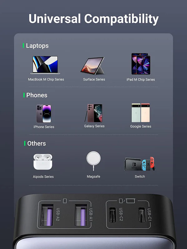 The UGREEN CD271 200W GaN Desktop Charger is a powerhouse designed for multi-device charging. With 4 USB-C and 2 USB-A ports, it supports simultaneous charging of laptops, tablets, smartphones, and more. GaN technology ensures efficient power delivery, compact size, and reliable performance for both home and office setups.