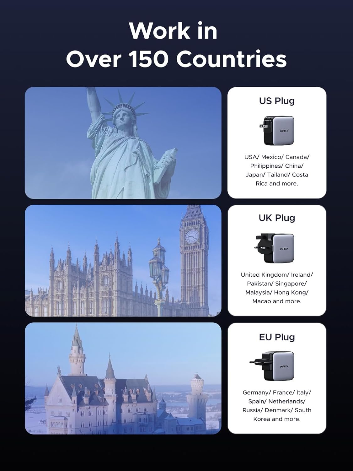 π Interchangeable Plugs β EU, UK, and US plugs for global use