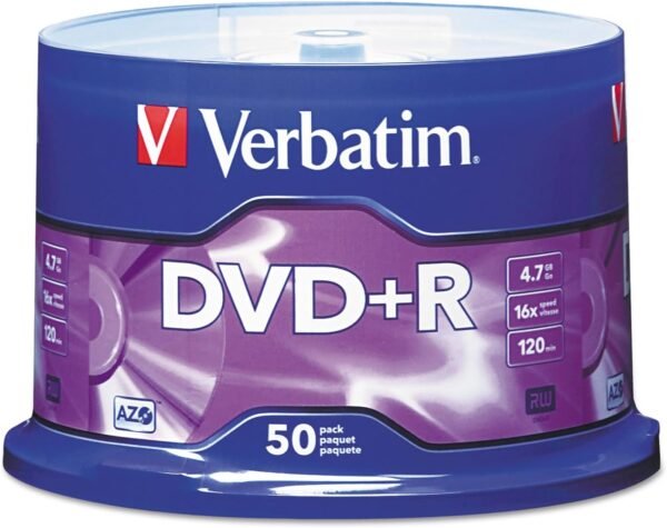 Verbatim DVD+R 4.7GB 16X with Branded Surface – 50pk Spindle (Model: 95037) – Write-once optical media for video and data archiving, featuring AZO recording dye and compatibility with 16X DVD+R drives