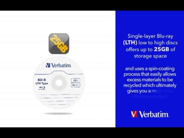 The Verbatim BD-R SL LTH Type 25GB 2x 5pk (Model 0903-20) offers a reliable solution for high-definition data storage needs. Each disc provides a capacity of 25GB, suitable for storing large HD video files, music libraries, and data backups. With a 2x write speed, these discs enable efficient recording. The LTH (Low to High) technology utilizes an organic dye that turns the disc’s reflectivity during recording from “low to high,” manufactured using a more efficient production process. This spindle pack includes 5 discs, ensuring you have ample media for your storage needs.