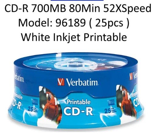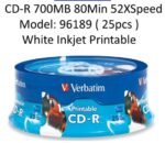 Verbatim 96189 CD-R 700MB 52X White Inkjet Printable – 25 Pack Spindle | Hub Printable | Fast Ink Drying | Superior Ink Absorption