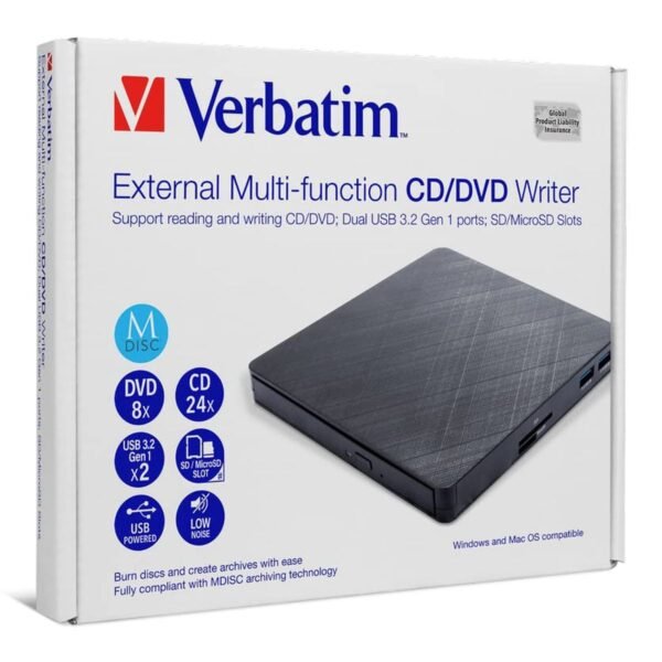 The Verbatim External Multi-Function CD/DVD Writer is a versatile solution for modern laptops and PCs without built-in optical drives. Supporting both CD and DVD formats, it allows you to read, write, and back up important files with ease. Designed with a USB 3.2 interface, it ensures fast data transfer and smooth performance. Beyond disc writing, it features a built-in USB hub and micro-SD card slot, making it a compact all-in-one device for expanding connectivity. Sleek, lightweight, and portable, this writer is perfect for business, education, and entertainment needs, offering convenience and reliability in one package.