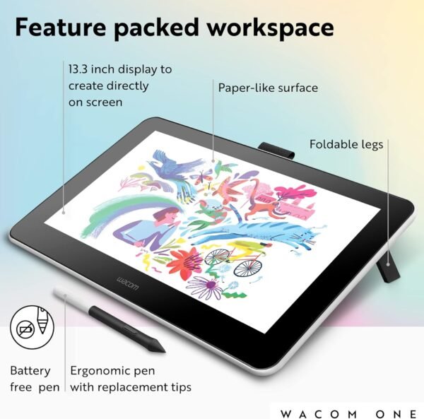 The Wacom One DTC133W0C is a versatile pen display designed for creatives, educators, and students. With a 13.3″ Full HD screen and natural pen-on-paper feel, it supports drawing, sketching, annotating, and editing across Windows, macOS, and Android platforms. The included battery-free pen offers 4096 pressure levels and tilt support, making it ideal for digital art, note-taking, and online collaboration.