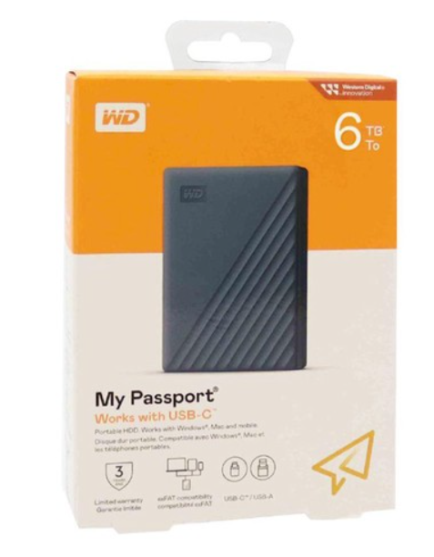The WD My Passport 6TB (Grey) USB-C edition is a sleek, portable external hard drive designed for modern devices. With a massive 6TB capacity, it provides ample space for photos, videos, music, and documents. Featuring USB-C connectivity, it ensures fast transfers and broad compatibility. Built-in 256-bit AES hardware encryption and password protection keep your files secure, while included backup software makes safeguarding your data effortless.