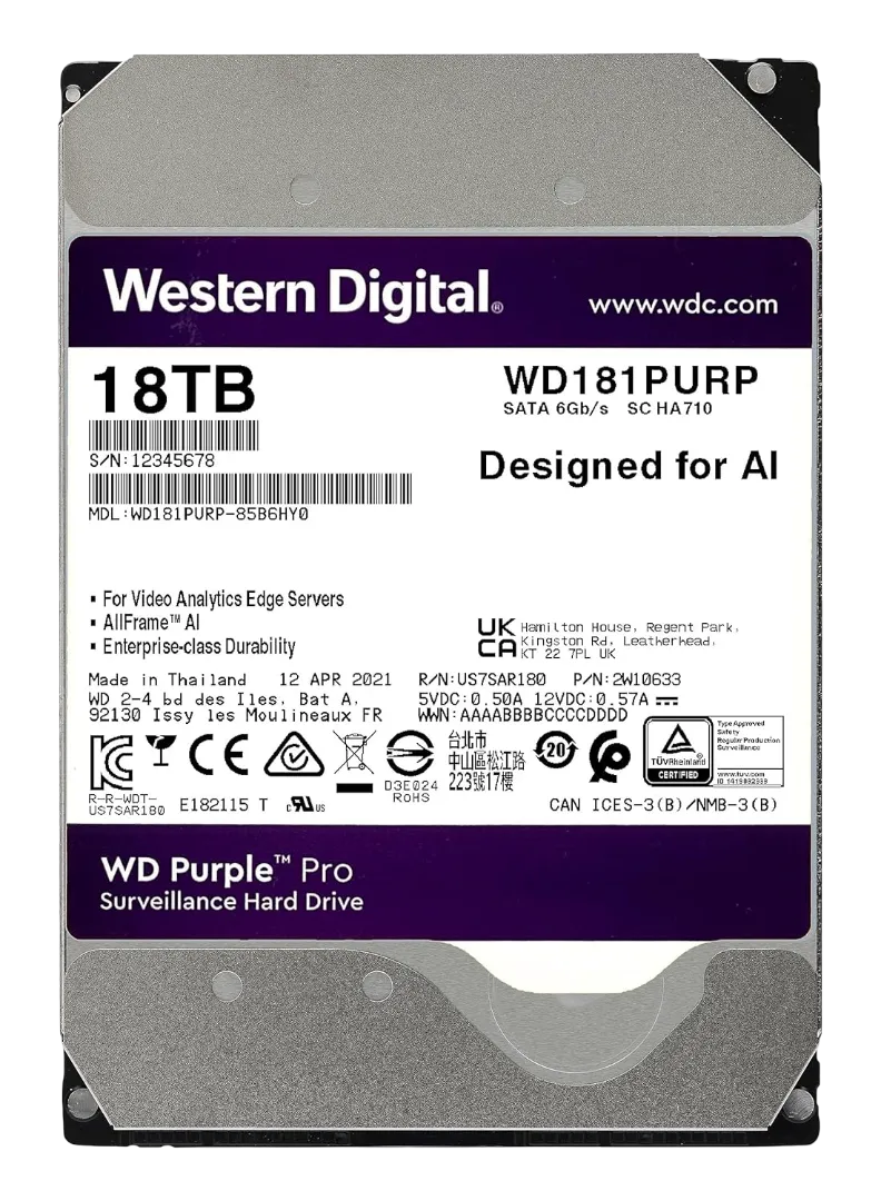 Western Digital WD181PURP WD Purple Pro 3.5″ 18TB Surveillance HDD – 512MB Cache, 7200RPM, SATA 6Gb/s, AllFrame AI Technology