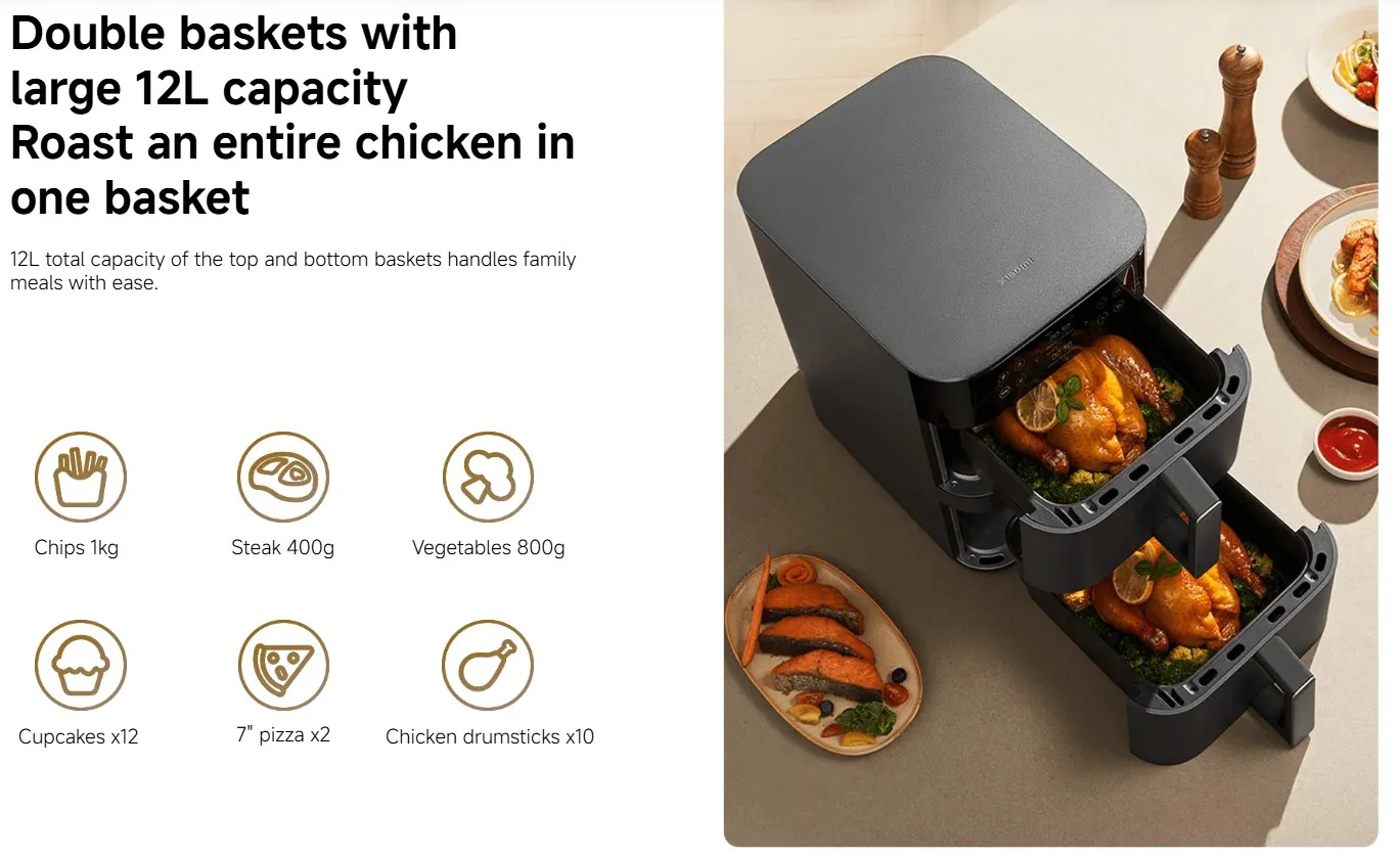 The Xiaomi Dual Zone Air Fryer 12L UK is a versatile kitchen appliance designed with two independent baskets, allowing you to cook multiple dishes at once. With smart controls, a large HD display, and 14 preset cooking modes, it delivers healthier meals with less oil while saving time and space in your kitchen.